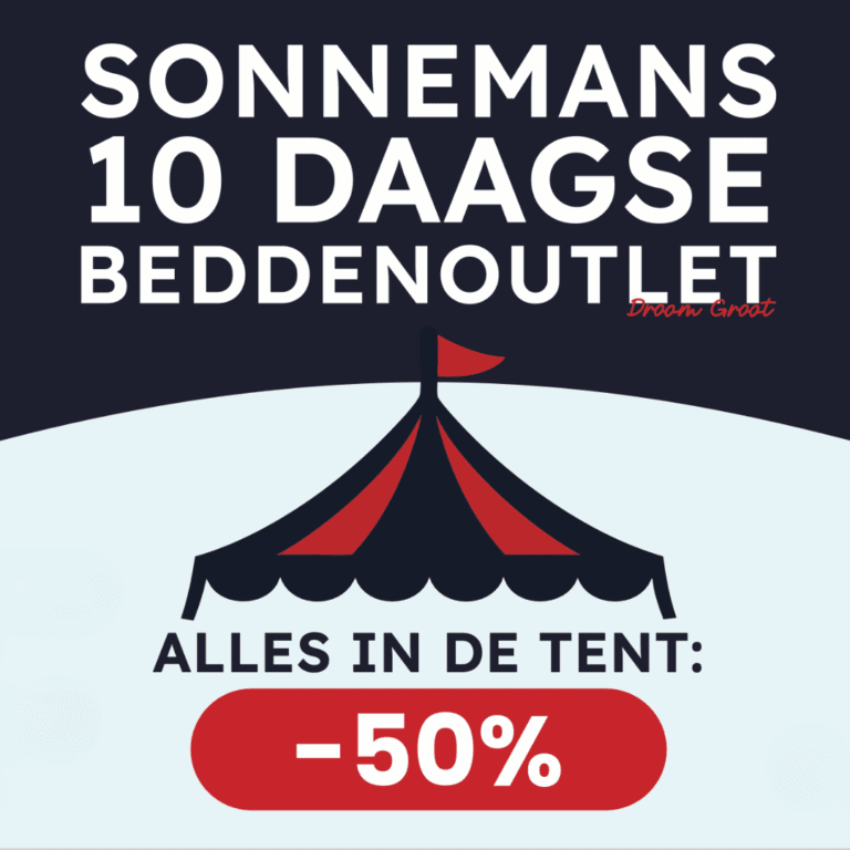 Tien dagen lang staat onze tent vol met boxsprings, matrassen, toppers en bedtextiel van topmerken. En dat allemaal met 50% korting.